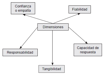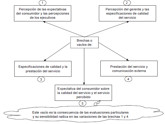 Duque (2005) hizo una descripción de los modelos de evaluación más reconocidos por su validez y confiabilidad, estos son: modelo nórdico o modelo de la imagen que relaciona la calidad con la imagen de la organización; modelo americano, con su escala SERVQUAL, que permite evaluar la calidad del servicio percibida mediante la medición por separado de las expectativas y las percepciones. Este modelo, después de una depuración, considera cinco dimensiones para determinar la calidad del servicio (figura 4) e identifica en el proceso cinco brechas o vacíos (figura 5) que influyen en la calidad del servicio.