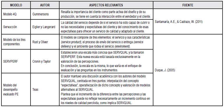 Desde la perspectiva de la percepción y de los modelos de evaluación, el modelo SERVQUAL (SQ) de Parasuraman, Zeithaml y Berry (1988) y SERVPERF de Cronin y Taylor (1994) son los más comunes y utilizados. Sin embargo, se pudo establecer a través de la revisión bibliográfica que estos dos modelos presentan vacíos que no se han resuelto y, si bien es cierto que han sido probadas con cierto grado de éxito, no necesariamente pueden aplicarse al servicio de educación superior (Annamdevula y Shekhar, 2012), pues no hay consenso en la literatura relacionada con el desarrollo y la definición de los factores determinantes de la percepción de la calidad del servicio de los estudiantes en la educación superior (Ling, Chai & Piew, 2010).