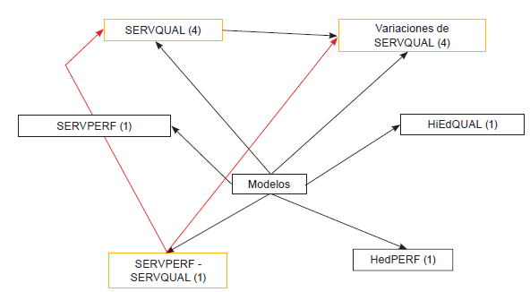 El modelo más comúnmente utilizado en estas investigaciones, bien sea como modelo directo, bien como base para otro tipo de escala, es el SERVQUAL (SQ) propuesto por Parasuraman, Zeithaml y Berry (1988), pues fue utilizado por Dursun, Oskayba y Gokmen (2014), Thi Hoang (2013), Faganel (2010) y Fitri Abu, Ilias, Abd y Zulkeflee (2008).