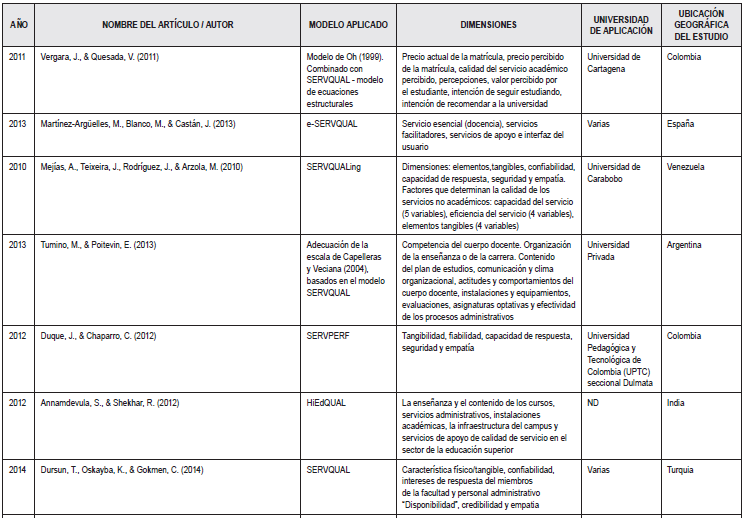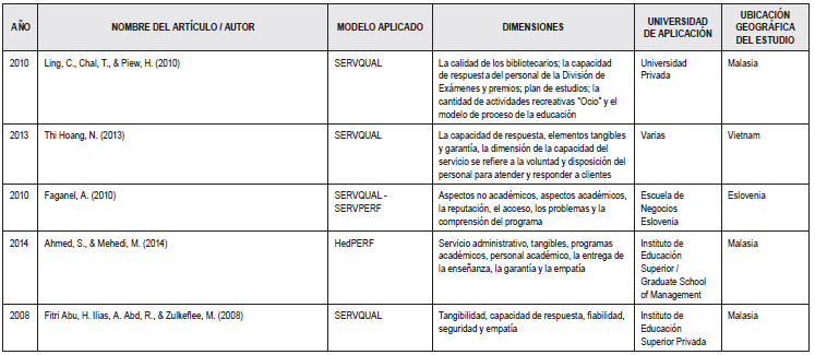 A partir de la anterior descripción conceptual, se presenta el análisis cualitativo de la revisión bibliográfica realizada de artículos científicos de cierto periodo, con el fin de identificar la aplicación de estos conceptos en el ámbito universitario y cómo estas han realzado la importancia del servicio en entidades que ofrecen servicios de educación superior. A tal efecto, y en aras de describir la importancia de la calidad percibida en los servicios de educación superior a partir del análisis adelantado, se intentará comprender qué modelos y dimensiones se trabajaron e identificaron en el desarrollo de las investigaciones en calidad percibida en educación superior y sus conclusiones para tener un acercamiento al propósito del artículo.