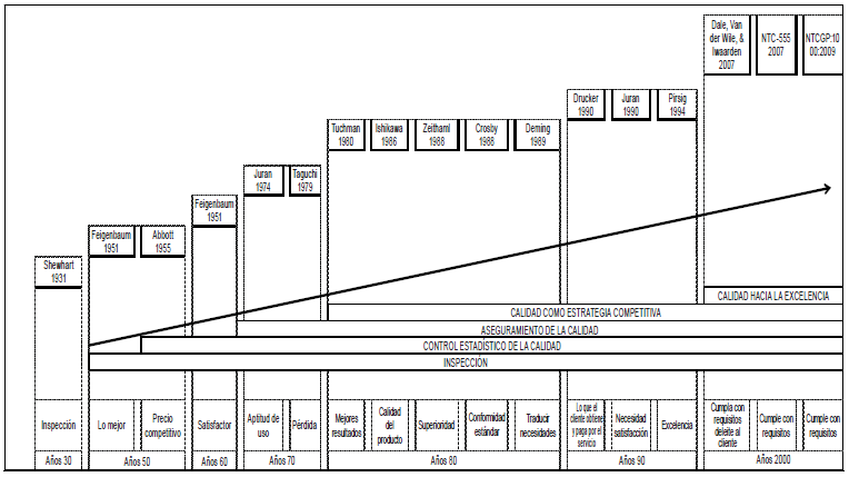 En primer lugar, la calidad es un concepto que ha evolucionado y se ha complementado a través del tiempo, en cuyo transcurso se ha enmarcado en una serie de fases (figura 9), como se muestra en la línea de tiempo donde se plasma su proceso evolutivo. Se identifica que la década de los noventa fue la más prolífica desde el punto de vista de producción intelectual sobre el tema.