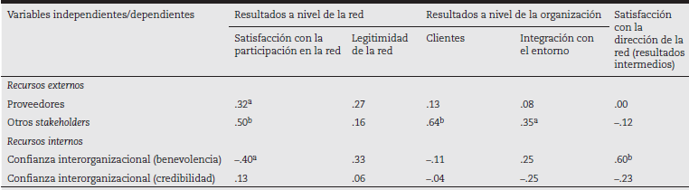 Tal como se observa en la tabla 1, la dimensión recursos externos de la red y sus dos variables tienen relación con la efectividad tanto a nivel de la red como a nivel de las organizaciones que la componen, aunque de manera diferenciada. En particular se observa que la variable otros stakeholders predice el grado de satisfacción con la participación en la red (R = .50; p < .01), clientes (R = .64; p < .01) e integración de las empresas con el entorno (R = .35; p < .05). En contraste, la variable proveedores solo predice el grado de satisfacción con la pertenencia a la red, variable que constituye una medida de efectividad a nivel de red (R = .32; p < .05).
