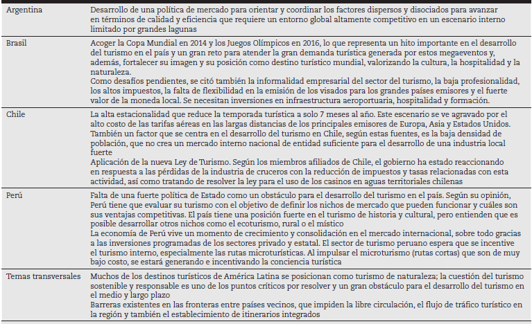 En la tabla 1 se muestran los compromisos y temas de discusión en materia de turismo de algunos países de la región, que en conjunto suman el 65% del turismo receptivo de Sudamérica.