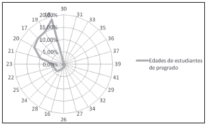 En este estudio se encontró que el promedio de edades de los estudiantes de la Konrad Lorenz es de 20 años, siendo los más representativos 18 años con el 18,75%, 19 años con el 15,13%,17 años con el 14,80% y 20 años con el 13,82%, todas las demás edades están por debajo del 10% en el total analizado (véase Figura 2). De acuerdo con estas cifras, el estudiante promedio de la Konrad Lorenz es favorablemente joven y su proceso de formación está apenas comenzando.