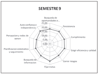 En este punto del ciclo académico es cuando se puede tomar un mejor perfil, ya que estudiantes que cursan noveno semestre tienen una visión mucho más clara y sus metas y objetivos están mejores definidos es por esto que la característica que más se destaca es la de fijar metas, en cuanto a la persistencia y la autoconfianza se puede decir que son características que van unidas a fijar metas ya que para alcanzar lo propuesto, lo fijado, es importante tener confianza en las habilidades que se tiene siendo persistente en alcanzar lo que se espera, siendo capaces de superar obstáculos y enfrentando desafíos.