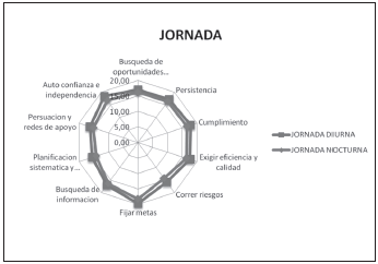 Tanto estudiantes de jornada diurna como de jornada nocturna tienen un perfil de personas que tiene una necesidad de logro ya que son personas que luchan por fijar metas, cumplir con compromisos, tener autoconfianza, esto quiere decir que son personas que encuentran mayor grado de satisfacción al encarar una situación de esfuerzo, prefieren realizar labores que requieran mayor responsabilidad personal en donde puedan superar obstáculos; así mismo, este tipo de persona tiende a hacerse responsable de su propio éxito o fracaso y toma riesgos moderados (calculados). Según McClellan los emprendedores tienen una alta necesidad de logro y baja necesidad de poder lo que hace que un emprendedor nato esté impulsado por el logro, lo cual crea en esta persona una necesidad por enfocarse en sí mismo y la búsqueda por optimizar su propio desempeño. (véase Figura 11).