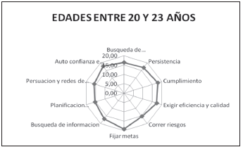Una persona que se encuentre en un rango de edad entre los 20 y 23 años aparte de fijar metas tiene muy claro que la búsqueda de información útil para tomar decisiones es importante para cumplir y lograr sus metas propuestas, así mismo un emprendedor de este rango de edad ya debe saber que habilidades posee para confiar en ellas y poder enfrentar retos y desafíos, además ya es consciente de las competencias propias que puede utilizar en beneficio de la compañía buscando autonomía y control de las reglas, y siendo responsable de sus propios éxitos y fracasos. (véase Figura 13).