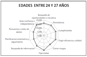A diferencia de las personas que se encuentran en el rango de 20 a 23 años, este tipo de personas (24-27 años) tienen un grado más alto en cuanto a retos personales y metas fijadas, esto puede deberse a que un emprendedor de este rango de edad ya tiene un negocio o está pensando en ponerlo y sus expectativas de crecimiento económico, laboral y profesional son más altas, se destaca el cumplimiento de compromisos y la autoconfianza, ya que al fijar metas el emprendedor cree cada vez más en las habilidades que posee confiando en sí mismo para no fracasar en el intento, el cumplimiento es fundamental ya que el emprendedor se sacrifica para obtener buenos resultados más que obtener buenas ganancias permitiéndole esforzarse más y realizando tareas más exigentes que le permitan cumplir con estas metas. (véase Figura 15).
