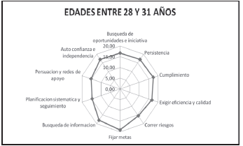 En personas de un rango de edad entre 28 y 31 años es notable que el fijar metas, buscar información y el cumplimiento hace parte de su perfil como emprendedor. Estas personas tienen un nivel de visión clara y una necesidad de poder que le permite el esfuerzo y esmero constante en conseguirlas, apoyándose en la información útil que encuentra para tomar medidas mucho más coherentes a la hora de tomar decisiones ya sea en la organización donde labora o en el negocio que administra. (véase Tabla 10 y Tabla 11).