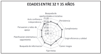 Aunque el perfil de este emprendedor es muy bueno aún sigue careciendo de habilidad para tomar decisiones y buscar redes de apoyo que le permitan evolucionar en sus metas ya alcanzadas y en las que están por alcanzar. Un emprendedor de 32 a 35 años va a estar siempre con un temor a correr riesgos, pero en un nivel más bajo ya que es consciente que de ellos puede aprender, sean negativos o positivos.