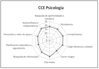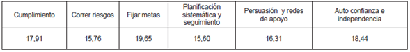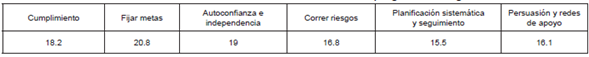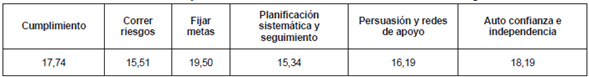 El programa de Psicología arrojó resultados que muestran un alto puntaje en las categorías de cumplimiento, fijación de metas y autoconfianza e independencia lo cual indica que la muestra posee una necesidad de logro impulsada por el alcance de metas y el trabajo individual, el cual define al emprendedor como una persona responsable de sus actos sin importar el resultado ya sea fracaso o éxito. (véase Figura 18).
