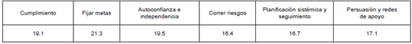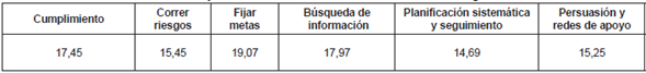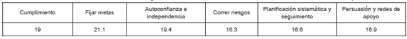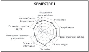 Las personas que están en primer semestre están construyendo los referentes en cuanto a tomar decisiones y crear estrategias para lograr alcanzar sus objetivos, ya que como se ve en los resultados, tienen un promedio bajo en cuanto a correr riesgos, planificar sistemáticamente y tejer redes de apoyo. Esto se debe a que una persona que hasta ahora está empezando a estudiar sabe que tiene que llegar a cumplir unos objetivos, unas metas, pero lo que no sabe es cómo llegar a hacerlo y qué apalancadores utilizar para esto.