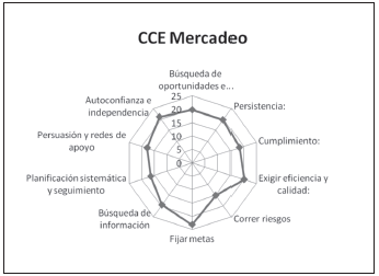 El programa de Mercadeo tiene los puntajes más altos del total de los programas, siendo la fijación de metas, la exigencia por la eficiencia y calidad y la autoconfianza e independencia los ítems con mayor calificación. La orientación hacia las metas hace de este, un grupo con necesidad de planeación, en donde la incertidumbre no puede ser decisiva para la toma de decisiones, sino que ellos se adelantan a los hechos asegurándose que todo esté bien en relación con los resultados esperados. (Véase Figura 21).