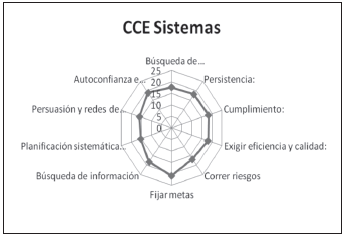 Los ingenieros de sistemas, en esta ocasión muestran una alta fijación de metas, el cumplimiento de estas y la independencia para realizar las actividades; son rasgos comunes, aunque sus valores son menores a los anteriores programas, también muestra una tendencia a la orientación al logro, cumplimiento del mismo, aunque existe una falta de planeación de riesgos y evaluación de los mismos, al igual que no existe una clara planeación de estrategias. (Véase Figura 22).