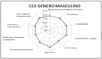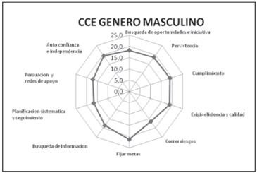 Los hombres de la muestra tienen una tendencia al individualismo, siendo este el ítem de más alta calificación en la encuesta, así como el cumplimiento de las metas que se fijan. Hay una diferencia entre hombres y mujeres en cuanto a la iniciativa y aprovechamiento de oportunidades, ya que estas últimas mostraron una preocupación mayor hacia la planeación y el desarrollo de actividades, mientras que los hombres se caracterizan por dar mayor importancia a la iniciativa según los cálculos en ese ítem. Este se encuentra en un punto estable entre el poder y la planeación, mientras que en la población de mujeres la tendencia es el acercamiento de la iniciativa a uno de los ítems más bajos. Lo cual nos lleva a inducir que existe un mayor deseo de logro en primera estancia por parte de los hombres en relación con las mujeres, no obstante, sin aclarar que el manejo de prioridades puede ser la causa de esta diferencia en el comportamiento emprendedor. (Véase Figura 25 y Tabla 21).