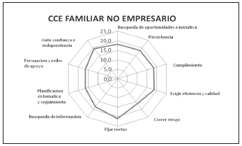 En cuanto a alumnos sin familiares empresarios se refiere, en todas las categorías se obtuvo un puntaje más bajo que en los alumnos con familiares empresarios siendo la evaluación de riesgos el más bajo de todos. Es coherente decir que la falta de planeación y grupos de apoyo para la correcta toma de decisiones es tal vez uno de los causantes de la falta de análisis de riesgos en las situaciones en las que el alcance de metas es importante. Este grupo se caracteriza por tener influencia dividida en las tres categorías, logro, poder y planificación.