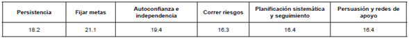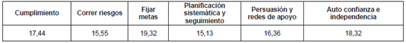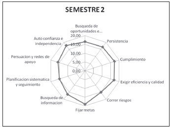 Por otro lado, los estudiantes de segundo semestre muestran un promedio muy bajo en cuanto a lo que se refiere a redes de apoyo, planificación sistemática y correr riesgos esto debido a su habilidad para formular estrategias y tomar decisiones no está aún muy desarrollado y les cuesta tener estas características en un promedio alto.