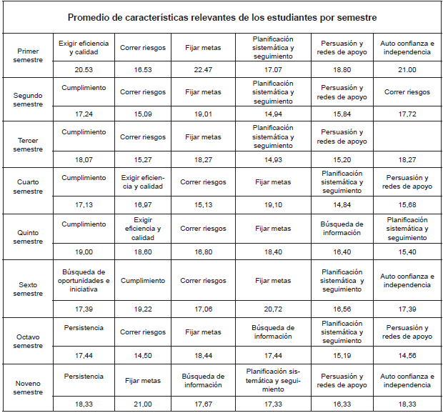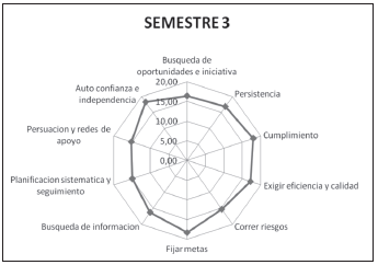 Las características en los estudiantes de este semestre que ocupan promedios bajos son correr riesgos, planificación sistemática y redes de apoyo, pero en comparación con los estudiantes de segundo semestre, lo que quiere decir que estos estudiantes en tercer semestre ya empiezan a adquirir habilidades y destrezas que ayudan a desarrollar más sus características de emprendedor