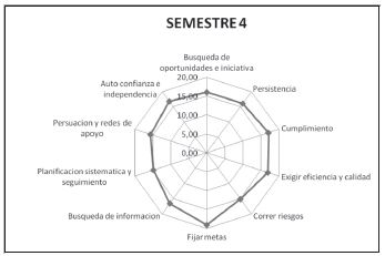 Los estudiantes de cuarto semestre empiezan a mostrar resultados interesantes en cuando a sus características emprendedoras ya que se resalta el fijar metas lo que quiere decir que a este nivel de formación académica los emprendedores tienen retos personales que son impulsados por las metas y objetivos que se fijan, y una necesidad de poder que permite el esfuerzo constante del emprendedor, además se destacan otras características como el cumplimento y exigir eficiencia y calidad lo que quiere decir que el emprendedor siente la necesidad de hacer las cosas mejores y más rápidas pero a la vez se sacrifica y se esmera por conseguir lo que se propone.