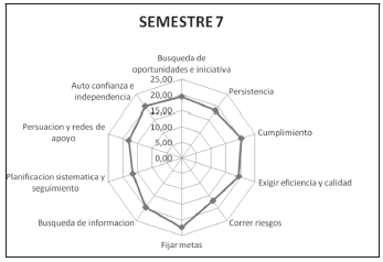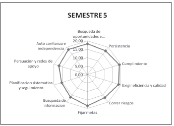 El avance en el ciclo o proceso académico muestra características que van ligadas a la necesidad de logro y planificación ya que como se puede ver en los resultados el cumplimiento y la exigencia de eficiencia y calidad son los promedios más altos junto con la fijación de metas, es importante resaltar que en los estudiantes de quinto semestre la fijación de metas ya no es tan alta como en los anteriores semestres y el perfil emprendedor se va modificando. (véase Figura 7).
