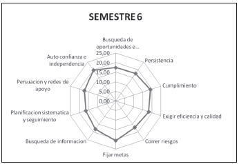 La planificación sistemática, la búsqueda de oportunidades e iniciativa y el correr riesgos son características que no están marcadas en personas de sexto semestre, esto puede ser debido a que se preocupan más por desarrollar habilidades para su autoconfianza y fijación de metas y aunque la búsqueda de oportunidades e iniciativa va ligada a la necesidad de logro estos estudiantes prefieren tener pleno cumplimento en sus compromisos que adelantarse a los hechos y aprovechar las oportunidades que se les da en el momento. (véase Figura 8).