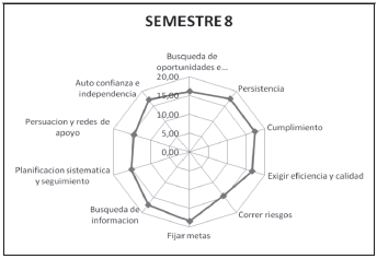 En estudiantes de octavo semestre entran a hacer parte características que antes no se habían mencionado como lo son la persistencia, la cual es fundamental para saber actuar frente a grandes desafíos, siendo capaz de superar obstáculos para alcanzar las metas fijadas, característica que aun sigue siento alta en los estudiantes, aquí a comparación de los estudiantes de quinto semestre la búsqueda de información es una característica con un promedio más alto lo que significa que estos estudiantes ya se preocupan por recurrir a fuentes útiles que les permita tomar decisiones permitiendo que el correr riesgos, la planificación sistemática y las redes de apoyo se puedan convertir en características cada vez más fuertes en el perfil de una persona emprendedora. (véase Figura 9).