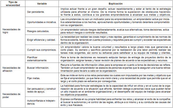 Variables psicográficas. Estas variables de comportamiento permiten la clasificación del emprendedor desde su necesidad más fuerte. Estas se clasifican a partir de las reflexiones de McClelland sobre las motivaciones, cada una de ellas se operacionaliza en la Tabla 1.