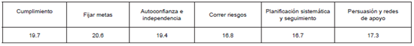 En esta categoría los estudiantes cuyos familiares son empresarios, mostraron una mayor calificación en la mayoría de los ítems. En este caso se inclinan más hacia la parte de cumplimiento, metas e independencia, siendo la falta de riesgos y estrategias planeadas el común denominador de menor calificación. (Véase Figura 26 y Tabla 22).