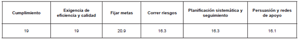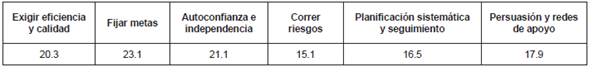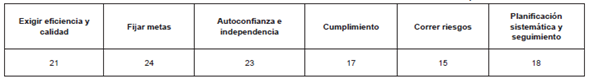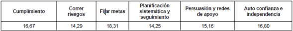 La búsqueda por la eficiencia impulsa a los emprendedores de la Escuela de Negocios a tener claridad en sus “objetivos” a corto, mediano y largo plazo. Esto va acompañado de una tendencia al cumplimiento a cabalidad de las tareas encomendadas y así mismo a realizarlas de forma responsable. En cuanto a la puntuación baja, cabe resaltar que en los resultados de la muestra se denota la debilidad en la planeación estratégica y corrección de falencias debido a la falta de análisis en cuanto a la evaluación de las expectativas que la organización tiene y la forma como se deben manejar los diferentes escenarios. De acuerdo a las cifras, existe una necesidad por impulsar aún más el deseo hacia el logro en los estudiantes de NI para mejorar el rendimiento de los mismos a nivel organizacional como personal. (Véase Tabla 15).