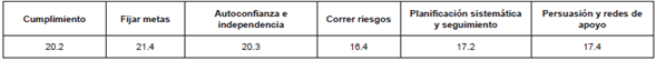 Características como la planificación y la persuasión de redes de apoyo, aunque tengan un promedio bajo van a seguir siendo constantes en un emprendedor ya que siempre va a sentir cierta prevención al tomar decisiones, estas características deberían tener un punto de apoyo en la búsqueda de información pero al no tener esta capacidad, es muy difícil la superación del temor. (véase Figura 10).