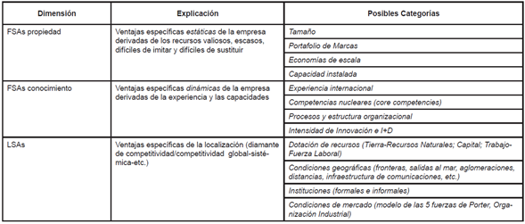 Las ventajas específicas de la empresa (FSAs) se entienden, desde la Teoría de Recursos (ResourceBased View) como aquellas que se originan en la propiedad de recursos valiosos, escasos, difíciles de imitar y difíciles de sustituir (VRIS por sus siglas en inglés) (Cuervo-Cazurra, Maloney & Manrakhan, 2007), mientras que desde la Teoría de Capacidades (Competence and Knowledge-Based View) las ventajas se originan en los procesos, capacidades, conocimientos y experiencia de la empresa (Cerrato & Depperu, 2011). La diferencia entre la ventaja competitiva ex ante local e internacional radica en la dificultad de transferir exitosamente las ventajas a un nuevo mercado (Cuervo-Cazurra, Maloney & Manrakhan, 2007); el éxito internacional de la empresa depende de la correcta correspondencia entre sus FSAs y las LSAs del país de destino (Rugman & Verbeke, 2009).(véase Tabla 1).