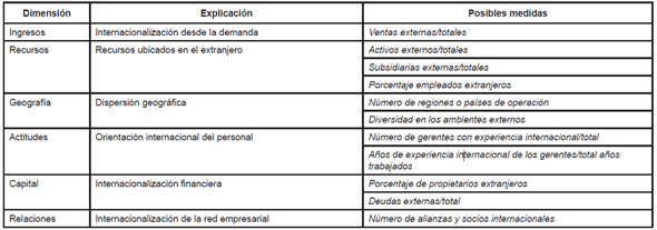 El perfil de internacionalización indica que tan internacional es una empresa, y a diferencia de la naturaleza cualitativa de la competitividad internacional ex ante, se calcula a partir de indicadores cuantitativos. Aunque tanto la UNCTAD con su TNI, como las medidas de grado de internacionalización (DOI por sus siglas en inglés) resumidas por Sullivan (1994) ofrecen aproximaciones a la medición de la internacionalización, se consideran inapropiadas para medir la competitividad internacional, pues medidas como la intensidad exportadora no necesariamente implican mayor rentabilidad o mejor imagen para la compañía. Cerrato y Depperu (2011) identifican 6 dimensiones medibles que se resumen en la Tabla 2.