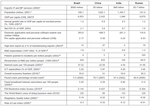 The exact nature of expertise, however, varies across offshoring domains. Brazil suffers from a lack of manpower to perform highly sophisticated technical work relative to other BRIC economies (See Table 1 for indicators related to IT and human capital). For instance, Russia’s competitive advantage lies in its ability to perform sophisticated technical works at relatively low cost (Cusumano, 2006). Multinationals are mostly undertaking adaptive R&D projects in Brazil compared to several innovative R&D works in India and China (UNCTAD, 2005). Number of researchers in R&D per million people is higher than India’s but Brazil underperforms Russia and China on this indicator (Table 1).