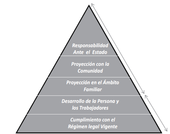 En la Figura 2 se define el orden de prioridad en la Responsabilidad Social Empresarial, diferenciándolo en dos dimensiones y ámbitos distintos. En primer lugar, la dimensión interna contempla la interacción de los recursos de la empresa en función de sus resultados por medio del cumplimiento con la institucionalidad, ya que una empresa no puede ser responsable socialmente sin cumplir con las exigencias mínimas que el marco legal vigente le impone. La ilegalidad y la poca transparencia son sinónimos de insostenibilidad organizacional en el tiempo.