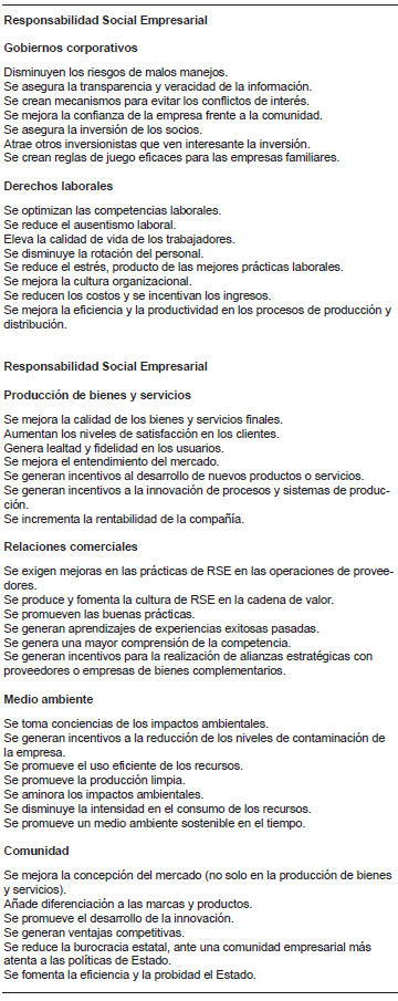 Para el caso de las Mi pymes y las empresas familiares, el trabajo que depara es aún mayor. En contraposición a la creencia de que la responsabilidad social empresarial solo enmarca factores externos a la misma compañía, es necesario generar incentivos a la formalización del empresario para su menor vulnerabilidad. El cumplimento de normas, la formalización del empleo, la introducción de procesos más eficientes, la consecución de estándares mínimos de calidad y la ejecución de sanas políticas financieras y contables, representan los eslabones mínimos de la dimensión interna de la RSE para este rubro de empresas.