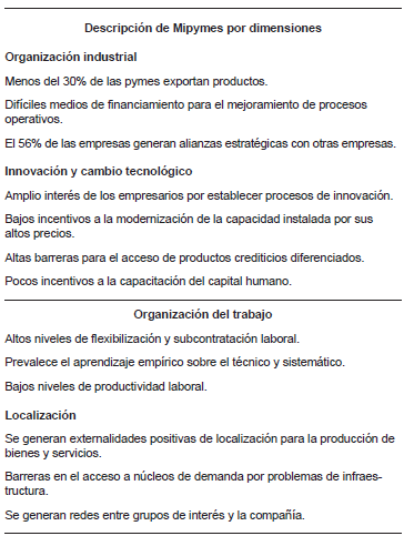 Como se denota en la Tabla 2, si bien las pymes logran generar ventajas competitivas ante un difícil entorno de oportunidades, como externalidades positivas de localización y estrechas redes de apoyo con grupos sociales de interés, se evidencian problemas estructurales importantes que impiden ampliar el ciclo de vida industrial de las mismas y las lleva a riesgo de declive en el mercado.