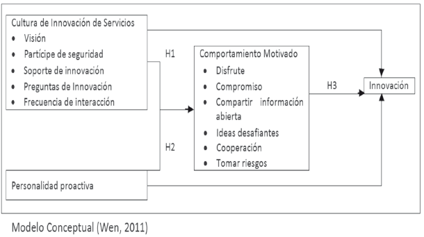 Otro aspecto importante donde ha habido más diferencias que encuentros es en la perspectiva teórica, y por tanto en el enfoque. Cada investigación usa un concepto particular de innovación, pero principalmente, da énfasis a un factor o elemento para su desarrollo. Wen (2011), se enfoca en el medio ambiente interno de la empresa (la cultura), y en la personalidad de los empleados como elementos clave, colocando al talento humano como punto de partida para la innovación en los hoteles. Con fundamento en esto, se basa en teorías como la de Persona-Entorno (Ajuste P-E) de Choi (2004), el Marco general para el desarrollo de las organizaciones de Crant (2004), el Comportamiento motivado (Sethi & Nicholson, 2001) y la personalidad proactiva (Crant & Seibert et al., 2001; Bateman & Crant, 1993). En la figura 1 se puede observar el modelo conceptual empleado por Wen, para orientar su estudio. Dada las implicaciones profundas del mismo, se comentan brevemente las posturas teóricas implicadas: