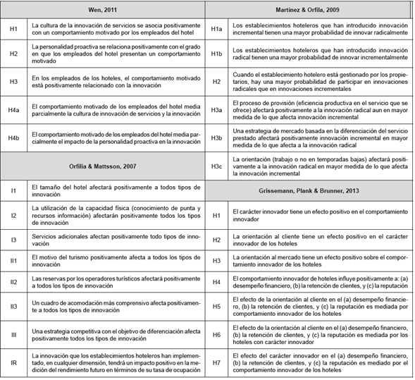 La tabla 1 hace un inventario de las hipótesis asumidas en los estudios encontrados sobre innovación en hoteles, con base en las cuales se hará la validación de los análisis en el apartado siguiente.