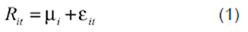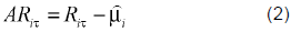 Where Rit is the period-t return on the market portfolio of country i, Ti is the constant mean of returns on the market portfolio of country i, T it is the period-t disturbance term of the return on the market portfolio for country i, and T it ~ i.i.d.(0,T ). With the parameter estimate of equation (1), one can measure and analyze the abnormal returns. Let ARiT, T = T1 + 1, T2, be the L2 abnormal returns for country i in the event window. Using the constant mean returns model to measure the normal return, the sample abnormal return in the event window is: