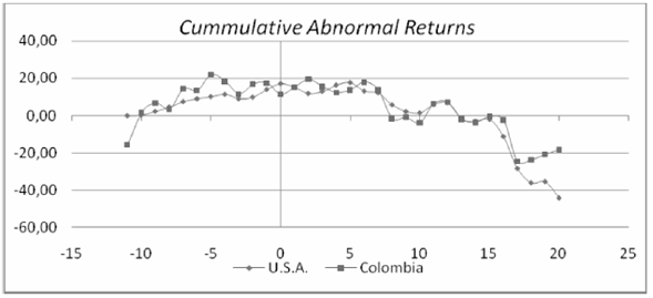 As Figure 1 shows, the cumulative abnormal returns on both the Colombian and the US market portfolios increase significantly for twelve months prior to the selected event month (May 2007) of the event window with the Colombia’s index having higher variance, indicating bull financial markets in both countries. The patterns of the Colombian and the US monthly abnormal returns on their market portfolios tracked each other very closely in the ensuing eighteen months, beginning at the selected event month. However, the Colombian equity market oscillated more widely, as compared to the US’s, around a steep downward trend, In the last three months of the event window, while the US abnormal returns continued to move downward, the Colombian stock prices took a sharp upward turn.