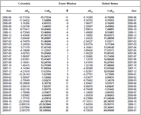 The task of isolating and measuring the total impact of the US subprime crisis on the Colombian economy may seem to be hopelessly impossible. Fortunately, long-horizon event study methodologies have been developed which may be utilized to analyze the effects of these economic events. This model measures the impact of an event on the economy as a whole by first calculating and then analyzing the “abnormal returns” on the indices of market portfolios (i.e. the financial instrument price indices.) The usefulness of such a study using financial market data is based on the assumption that markets are rational and efficient; thus, the effects of any newsworthy event will be reflected immediately in security prices and hence in indexes of a market portfolios. Thus a measure of an event’s economic impact can be constructed using financial market data observed over a relatively short time period. In contrast, measurement by direct productivity may require many months or even years of observation, before the effects can be measured, (Mackinlay, 1997, p. 13).