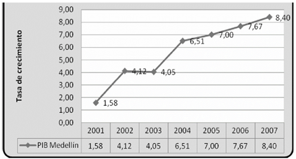 Como puede apreciarse en la Figura 1, el PIB de Antioquia creció en forma significativa entre 2001 y 2007 (Medellín y el Valle de Aburrá representan cerca del 60% del PIB departamental según datos del Dane).