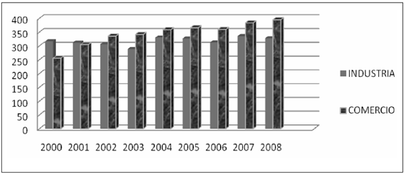 En el período 2000-2008 el empleo en el sector comercio aumentó en mayor proporción que en el sector de la industria (ver Figura 10). Entre 2001 y 2002 el sector comercio aumentó los empleos en un 29% y a partir de este año continuó creciendo en un 3% aproximadamente; mientras que, en la industria, en los primeros años mostró decrecimiento hasta el 2004 y de ahí en adelante aumentan levemente. No obstante, es necesario resaltar que en 2006 y 2008 decrece el empleo.