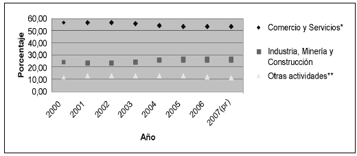 El comportamiento reciente de la contribución sectorial al PIB departamental y de la ciudad muestra un ligero repunte de “industrialización”. Tal como se aprecia en la Figura anterior, con la recuperación y auge económicos que siguieron a la recesión de 1998-1999, la tercerización cedió un tanto mientras los sectores mineros y de la construcción recuperaron la participación. Entre 2000 y 2007, la contribución del tercer sector cayó en 2,6% mientras minería y construcción crecieron en 2.06%. Lo que ocurrió fue que mientras actividades como el comercio y la intermediación financiera incrementaron su participación en 0,7 y 0,62% entre 2001-2007, respectivamente, otros servicios de peso como los relacionados con actividades inmobiliarias, empresariales y de alquiler, por un lado, y los de administración pública, por el otro, redujeron la suya en 1,86 y 2,17% respectivamente para el mismo período. Esto contrasta con la situación creada por la confianza de inversión y los proyectos en infraestructura que lograron imprimir un particular dinamismo al sector de la construcción, que tuvo un crecimiento de casi 3% a lo largo de todo el período frente a una leve caída de menos de medio punto en el sector manufacturero y un aumento de 0,05 a 0,3% en minería6.