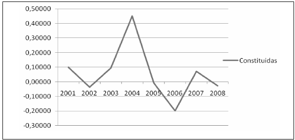 El ciclo de vida de las industrias13, la territorialidad14 y la productividad son tres ejes de encuentro en el desarrollo de las potencialidades competitivas de un sector o de una región. La creación de empresas se extiende en el territorio de acuerdo con las dinámicas que se generan en el sistema productivo, lo cual implica nuevas obligaciones. Deben buscarse no sólo ventajas estáticas comparativas sino también la generación continua de ventajas dinámicas competitivas territoriales que propicien la circulación de conocimiento e innovación constante en su interior. La Figura 4 muestra la capacidad empresarial del territorio: la tendencia en la constitución de sociedades que indica la inestabilidad y el riesgo del desarrollo empresarial local.