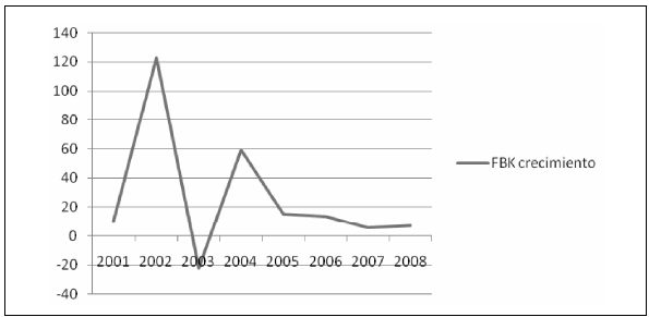 Primero, la Formación Bruta de Capital (FBK), la Tasa Media de Ganancia (TMG) industrial y la competitividad muestran la consolidación, en parte, del proyecto de ciudad. En la Figura 5 se observa que en el período 2000-2008 se tienen dos momentos en los cuales la FBK ha aumentado considerablemente (2002 y 2004); por su parte, en 2003 se presenta un fuerte decrecimiento. A partir de 2005 empieza una disminución paulatina15. No obstante, resulta preocupante la inestabilidad y el descenso en la tasa de inversión. En cuanto a la TMG, como se expuso con antelación, se mantiene a través del tiempo en casi todos los subsectores industriales.