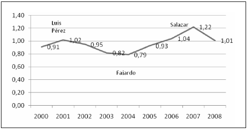 Segundo, teniendo en cuenta el comportamiento de la relación gasto/ingreso, que puede considerarse como una expresión del balance fiscal para el período 2000-2009 (Figura 6). Como puede apreciarse, la tendencia que se observa en el comportamiento del indicador es cuestionable respecto a la capacidad institucional para generar proyectos sostenibles que lleven al apoyo de la creación de empresas y a la generación de empleo.