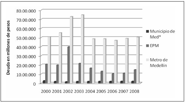 En esta primera década se da cuenta de tres momentos que corresponden a las acciones de tres gobiernos diferentes, donde el endeudamiento, en promedio, ha sido de $200 mil millones. Como puede verse en la Figura 7, se presenta el endeudamiento del municipio, del Metro y de EPM. El municipio disminuyó significativamente su deuda del 2000 al 2002 (aproximadamente un 40%); en 2003 aumenta el saldo en un 20% y a partir de ese año se estabiliza. Por su parte, el saldo de la deuda del Metro tiene un aumento del 30% en 2002 y una disminución del 32% en 2004, el resto de los años tiene un incremento, en promedio del 3%.