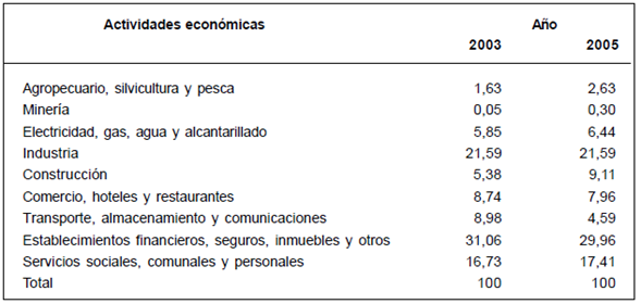 Un fenómeno similar puede apreciarse en Medellín y el Valle de Aburrá si se compara la situación entre 2003 y 2005. En efecto, el sector terciario pasó de contribuir con el 65,5% al 59,92%, mientras industria, construcción y minería pasaron de aportar el 27,02% al 31,01% al PIB subregional entre un año y otro, lo que significa una caída de 5,58% en el primer caso y un incremento de 4% en el segundo. Nuevamente, como se muestra en la Tabla 1, el aquí denominado repunte de “industrialización” sólo ha sido posible por el dinamismo del sector de la construcción y no por el de la industria manufacturera.