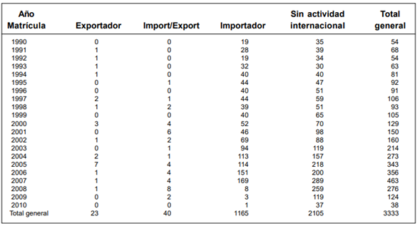Haciendo un análisis transversal simple de la información suministrada se filtra la base de datos y se tienen en cuenta únicamente los datos de 1990 a abril de 2010, donde se encuentra que con la aparición de la Ley MiPyme en 1990 las actividades internacionales según el año de matrícula se comportan como se ilustra en la Tabla 2 a continuación: